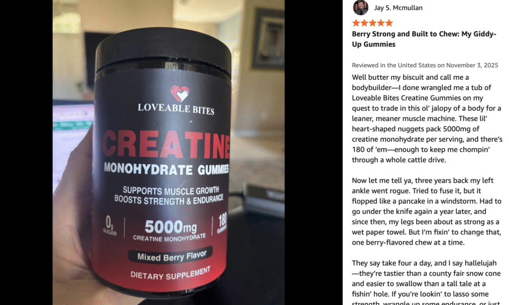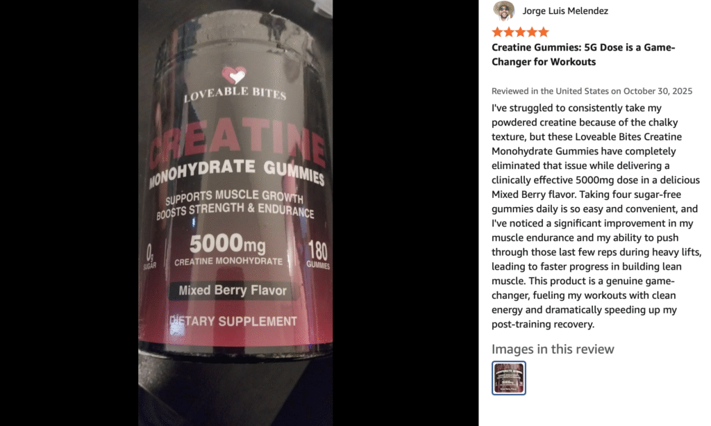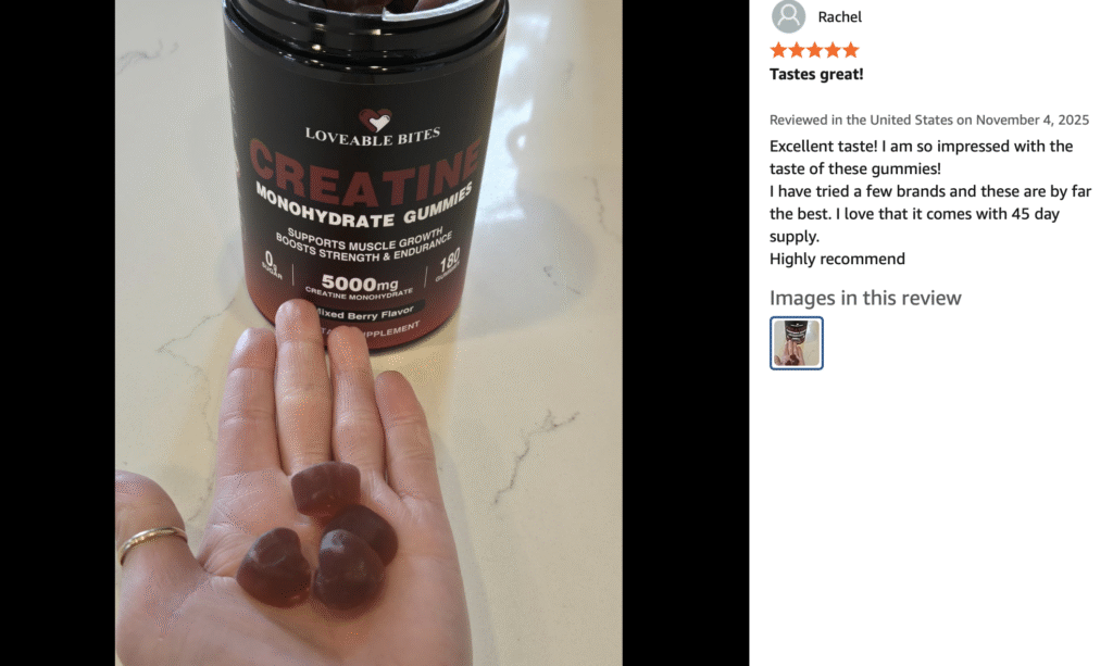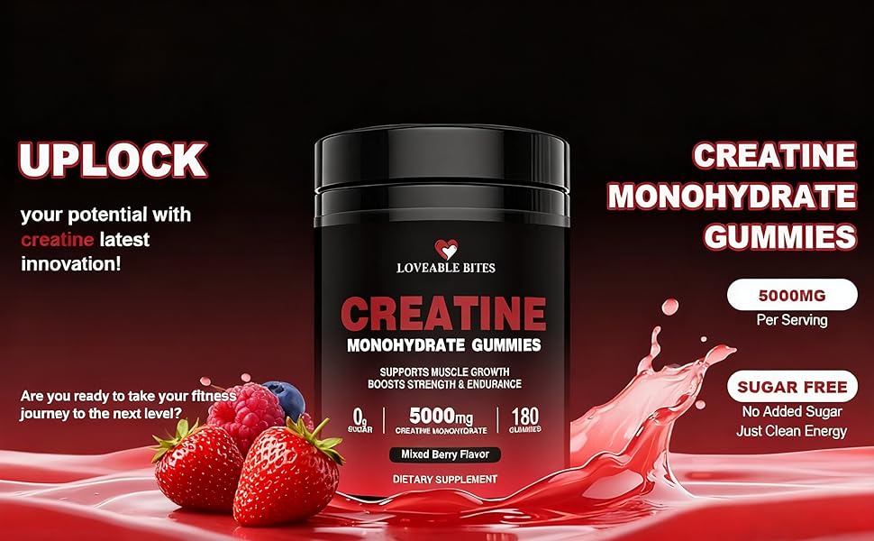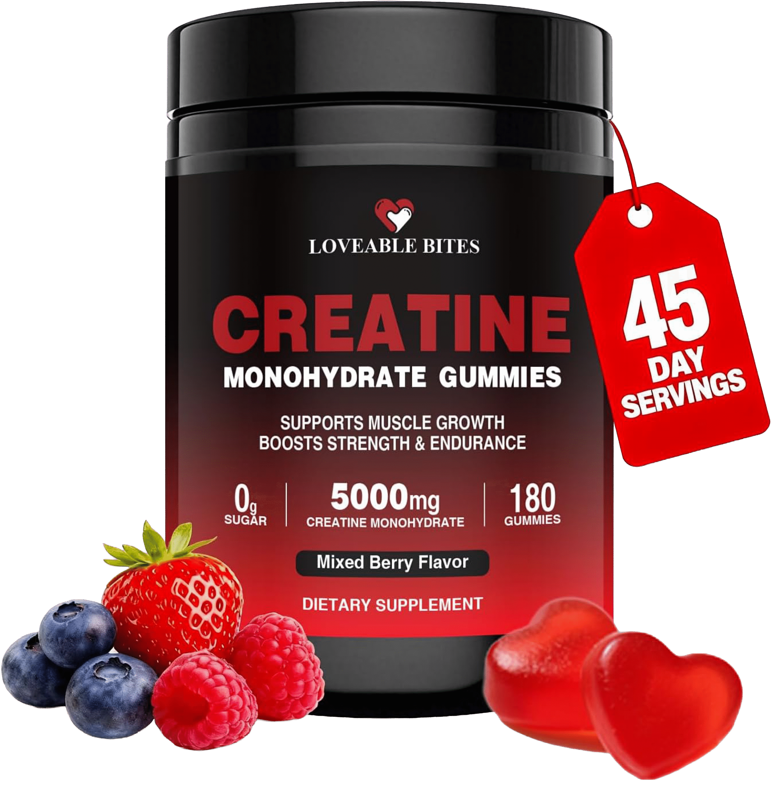 SHOP NOW ON AMAZON Loveable bitesDominate Your WorkoutsThe World’s Most Powerful Creatine, Now in a Delicious Gummy. SHOP NOW ON AMAZON TestimonialsHear what our satisfied clients have to say about their experiences with us. EXPERIENCE THE FULL SPECTRUM OF BENEFITSZero Compromises. Zero Added Sugar. Just Clean Energy. Delicious Mixed Berry FlavorFuel your muscles for optimal development and size. 5000mg Creatine MonohydrateCrush fatigue and power through your most demanding sets. 0g Sugar, Just Clean EnergyReach your peak potential in the gym and beyond. READY TO ELEVATE YOUR WORKOUT EXPERIENCE? Stop settling for average results. Join thousands of athletes who have made the switch to Loveable Bites Creatine Gummies. SHOP NOW ON AMAZON